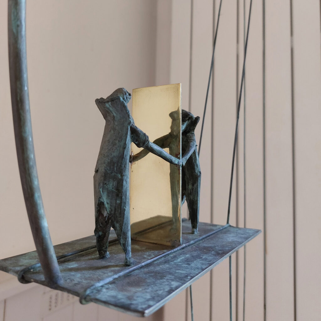 LE DOUBLE ET SON REFLET (détail); sculpture suspendue, bronze et métaux cuivreux, H=95cm, 1998