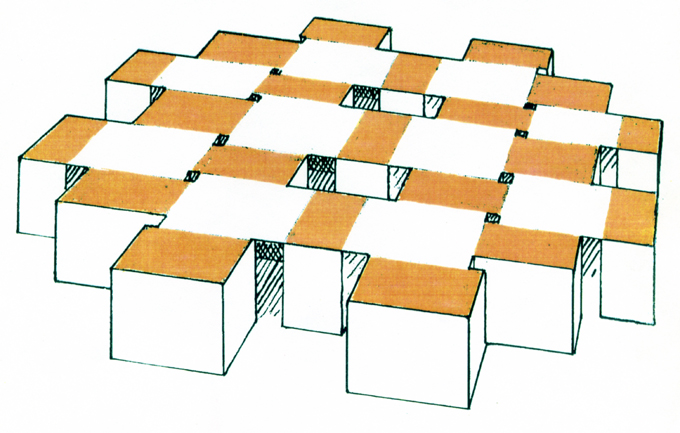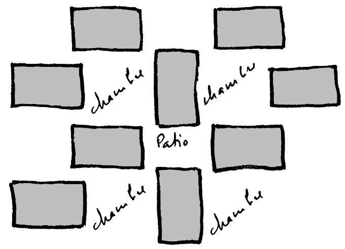 (…) Chacune des chambres forme une bifurcation, conduisant à deux autres chambres. À intervalles réguliers s’y forment des patios. Chacun communique avec quatre chambres distinctes.
