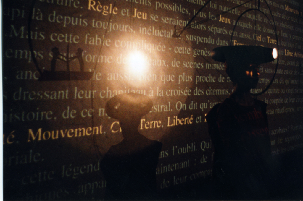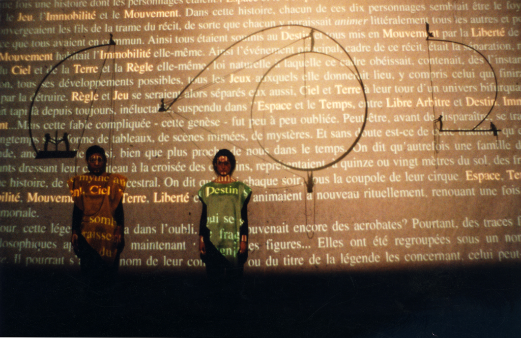 Sur les murs se faisant face de part et d’autre d’une salle de 12 mètres de long, est projeté un texte énigmatique, l’évocation d’une histoire originelle ou mythique. Chacune de ces deux projections est le reflet de l’autre, comme s’il s’agissait de deux grands miroirs. Le public est disposé le long des deux autres murs de cette salle. Le mythe dont il est question dans ces deux projections a pour nom « Le Cirque Philosophique », et cette histoire existe aussi, non moins énigmatique et fragmentaire, sous forme de sculptures suspendues. Plusieurs de ces sculptures sont suspendues en hauteur sur la trajectoire des projections, de sorte que leurs ombres se découpent, tels des hiéroglyphes ou des idéogrammes, sur le texte projeté. Dans ce texte, dix mots apparaissent fréquemment qui sont mis en évidence par une typographie plus claire, ce sont les dix concepts du Cirque Philosophique : Règle, Jeu, Temps, Espace, Ciel, Terre, Liberté, Destin, Mouvement, Immobilité. Lorsque le spectacle commence, les acteurs sont placés contre les murs recevant les projections, de façon à ce qu’un de ces dix mot s’inscrive sur chacun d’eux. L’un des acteurs cependant est au centre de la salle, sur une ligne médiane qui sépare le plateau en deux parties symétriques. A ses pieds, une lampe en forme d’anneau est posée, et l’action commence au moment ou il s’en empare, l’allume et en mouvement les autres acteurs-concepts en les éclairant. Les projections du texte sur fond noir et cette lampe anneau qui passera d’acteur en acteur sont les seuls éclairage d’une scène qui se trouve donc en grande partie dans la pénombre.