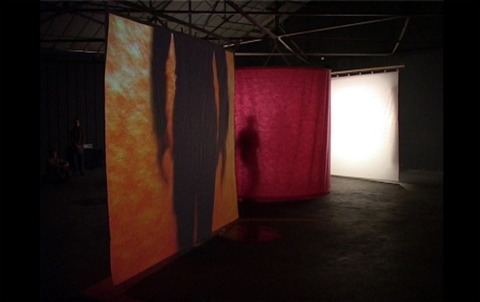 Un gros cylindre de tissu rouge est suspendu au plafond, légèrement flottant juste au dessus du sol. À l’extérieur de ce cylindre est disposé un écran blanc. Le public va et vient autour de ce dispositif très simple. Le chorégraphe Marc Vincent et le Plasticien Christophe Loyer prennent place à l’intérieur du cylindre, devenu leur espace de performance. À travers le tissu, on ne les aperçoit qu’à l’état de silhouettes mouvantes. Rien n’est suffisamment clair pour qu’on distingue la manipulation d’une caméra, à laquelle ils se livrent. En revanche, les images en sont synchroniquement retransmises sur l’écran.
