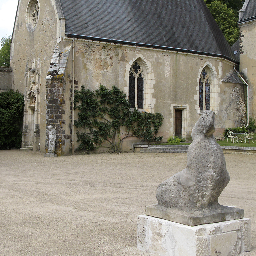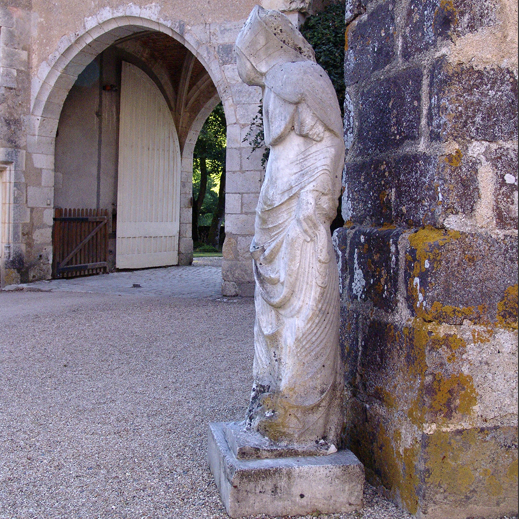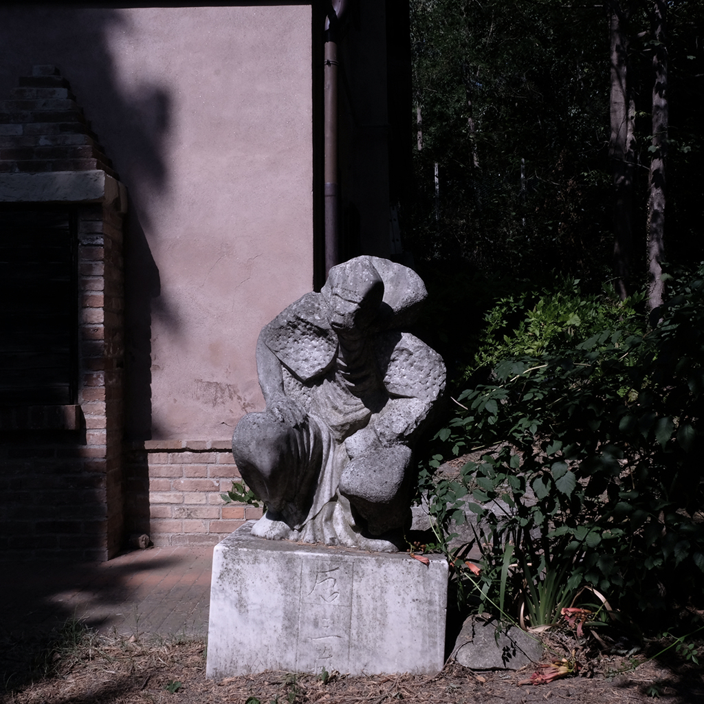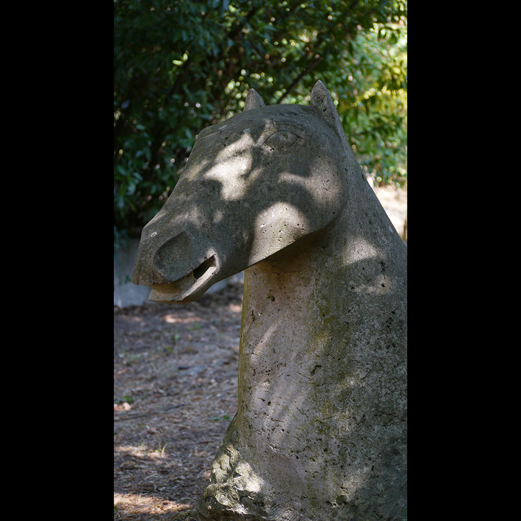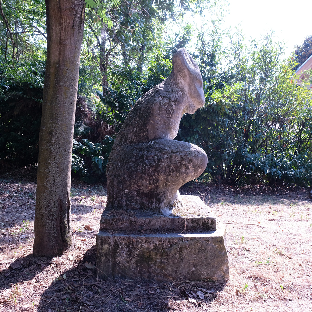 1 et 2: SOUEN WOU KONG le singe de pierre capable de toutes les transformations (marbre blanc, H=110cm, 1981; 3 et 4: TAN SAN TS’ANG le moine bouddhiste chargé de ramener les livres saints du Bouddhisme en Chine ((marbre blanc, H=110cm, 1981); 5 et 6: LE CHEVAL D’OR de Tan San-Ts’ang (travertin noce, L=200cm, 1988); 7 et 8: LE GARDIEN DU TEMPLE (marbre blanc, H=130cm, 1987). Maison d’Armand Gatti, Pianceretto, Italie